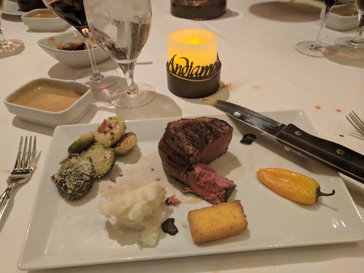 I think this is my new favorite steakhouse in Las Vegas! My best friend and I came here to celebrate her birthday, and Andiamo did not disappoint. I loved everything: the bread, the little relish-y spread with the eggplant, tomatoes, capers, and olives (and I generally can't stand olives at all, but I ate this like it was going out of style), the surprise spaghetti (I had no idea the angel hair pasta was coming, so that was a nice treat), the BBQ shrimp, the filet mignon with gorgonzola crust, the massive chocolate cake, and the fact that they brought out a pretty crème brûlée for my friend's birthday. Our server was an older blonde woman who was so friendly and sweet, and it was a pleasure to have her wait on us. Literally everything about this place was awesome. It's such a contrast to the D Casino & Hotel itself. At Andiamo, the air conditioning works, it doesn't smell like smoke, and the music from the Fremont stages isn't rattling the entire area, none of which I could say about the hotel itself (we had an unfortunate stay in one of the rooms during the second half of our trip). It's peaceful, lovely, and most of all, delicious. I highly recommend going here. It's been 6 days since we dined there, and I've thought about it literally every day.